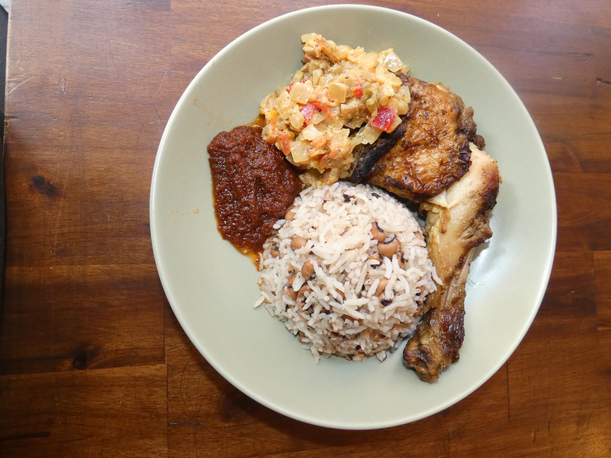 Ingrédients : riz, niébé; eau ; Sauce (oignon, poivrons, moutarde, huile, sel, poivre) ; Dja (tomate, crevette, sel, poivre, bicarbonate alimentaire).