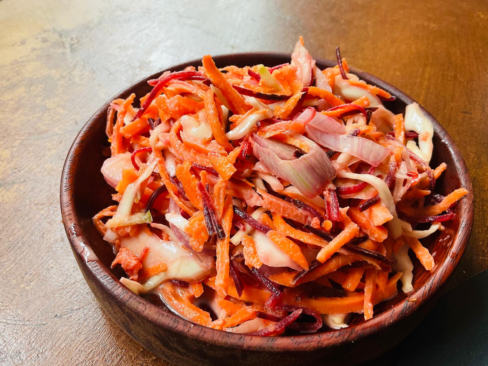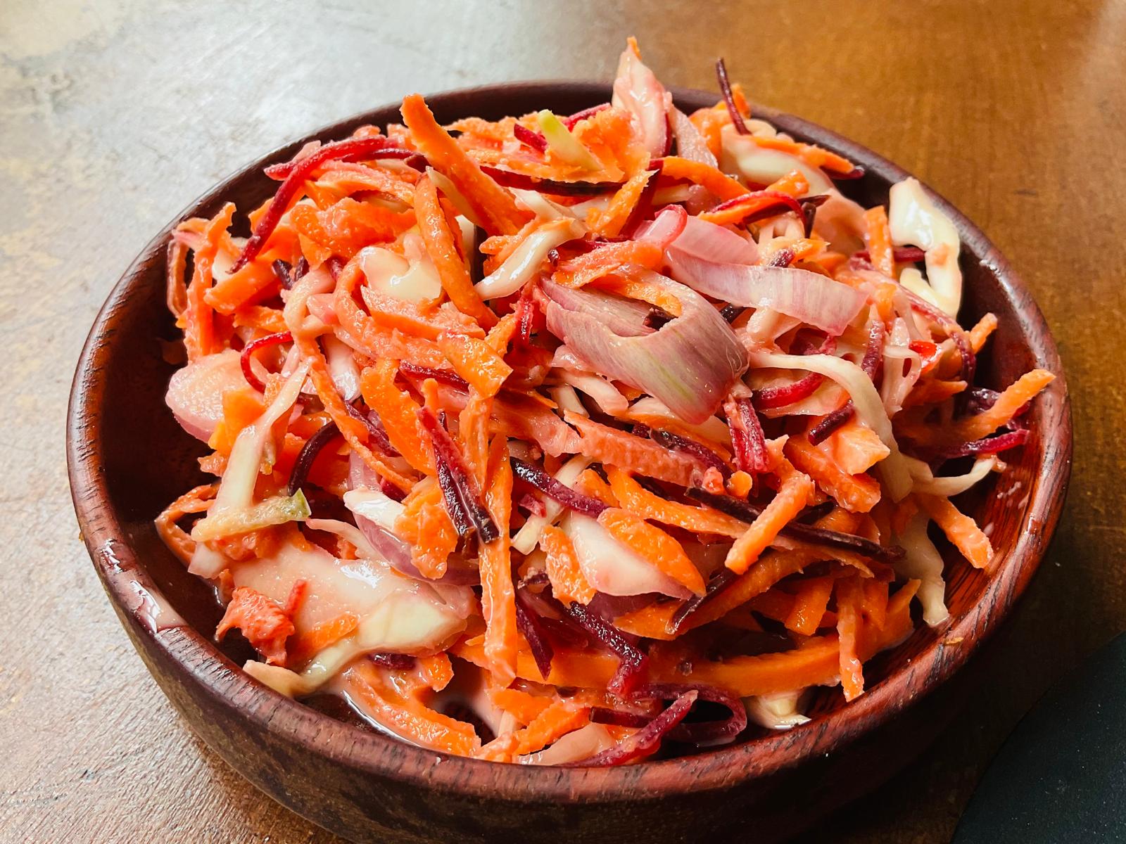 Ingrédients : carotte, chou blanc et rouge, poivron, échalote, jus de citron, vinaigre, cube, sel.